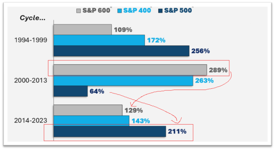 아래 그래프는 1990년대 중반 이후 소형주, 중형주, 대형주에 대한 다양한 사이클에 걸친 성과입니다.