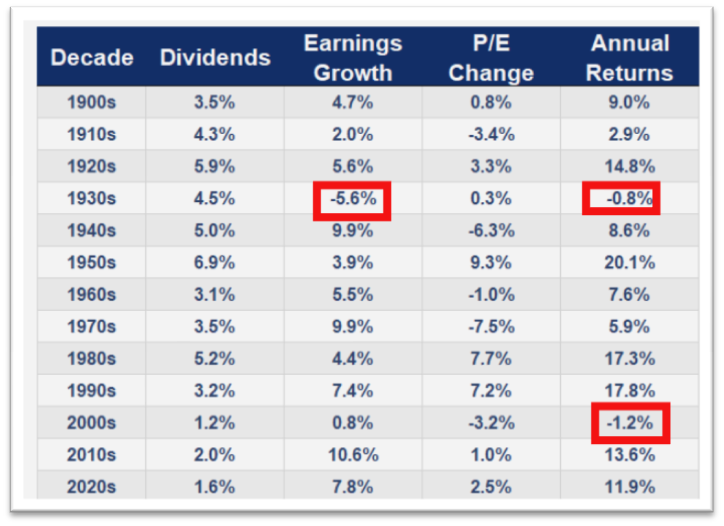 보글은 자신의 저서 '돈 카운트 온(Don't Count on It)'에서 20세기 초로 거슬러 올라가 주식 시장의 각 10년에 자신의 공식을 적용해 펀더멘털 기대치가 실제 수익률과 얼마나 잘 일치하는지 확인한 바 있습니다.