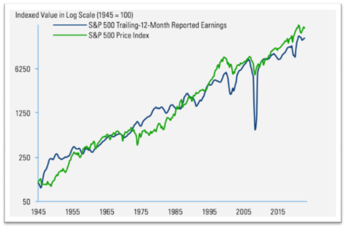 사실, 장기적으로 주식 펀더멘털은 여전히 주식 시장의 성공에 중요한 역할을 하고 있기는 합니다. 아래 제2차 세계대전 종전으로 거슬러 올라가는 S&P 500 지수 대비 실적 차트를 확인해 보시면 쉽게 알 수 있습니다.