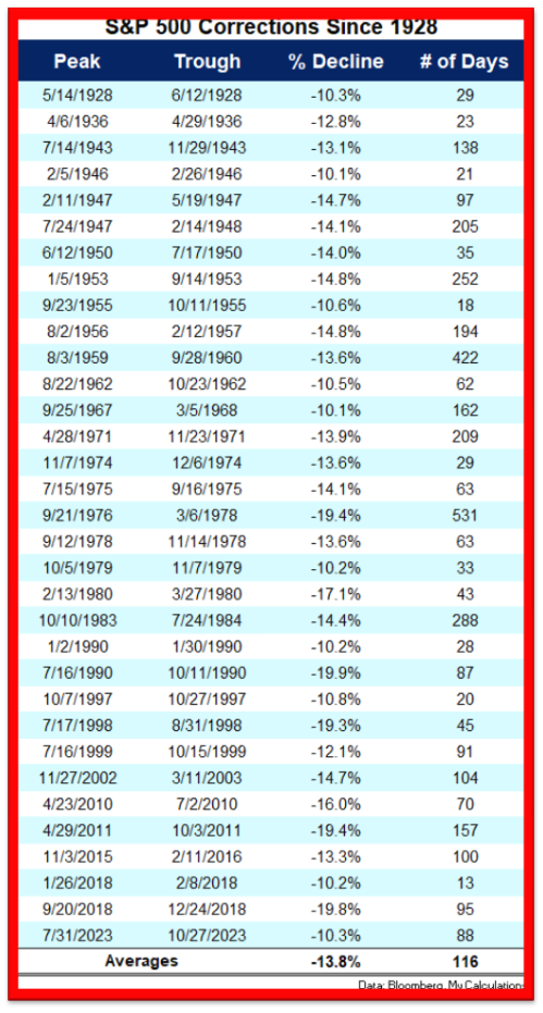 제가 세어보니 지난 97년 동안 33건의 수정이 있었습니다. 평균 건전한 조정은 13.8%의 손실로 고점에서 저점까지 평균 116일 동안 지속되었습니다.
